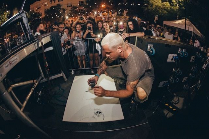 Depurar las líneas fue el siguiente paso antes de convertirse en un Mister del goteo, cuya compleja obra es tan fácil de identificar como difícil de imitar. Y es que el método esconde las dificultades del life painting performance o actuaciones en vivo, en las que el retratado forma parte de un público que añade presión al goteo, ese gesto milimétrico de Mr. Dripping con el que cada gota derramada aumenta la sospecha del rostro que protagonizará la obra completa.