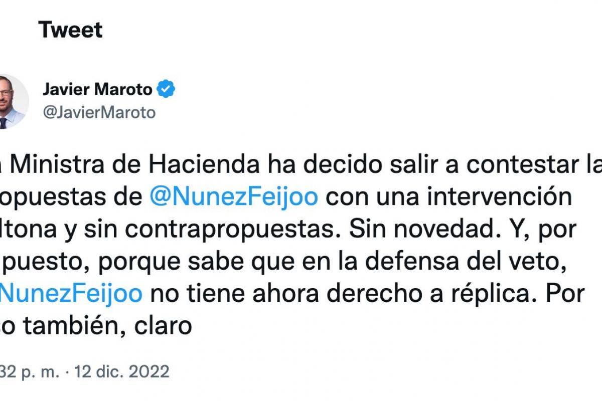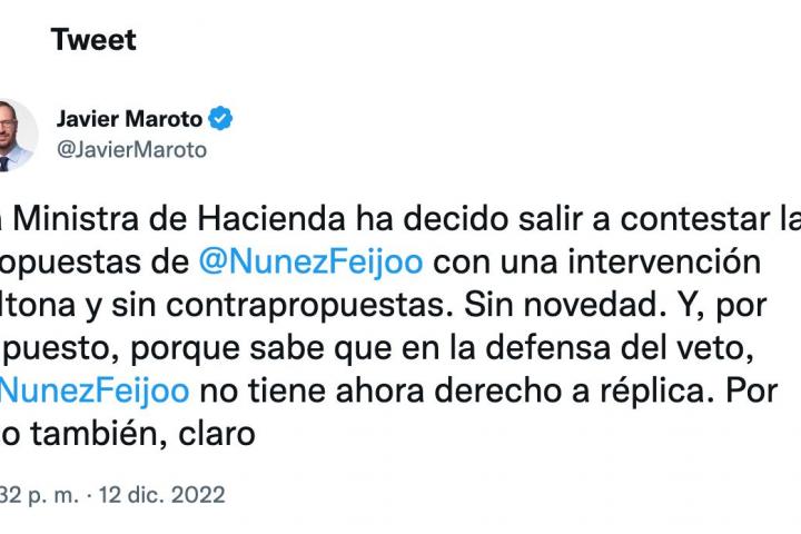 Ya en Twitter, Maroto ha escrito: “La Ministra de Hacienda ha decido salir a contestar las propuestas de @NunezFeijoo con una intervención faltona y sin contrapropuestas. Sin novedad. Y, por supuesto, porque sabe que en la defensa del veto, @NunezFeijoo no tiene ahora derecho a réplica. Por eso también, claro”.