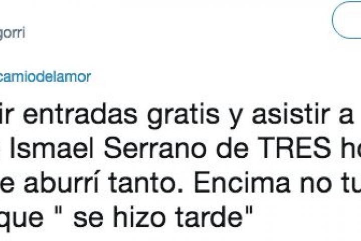 Dora (@LicBaigorri) le recriminó que su concierto fue poco entretenido y muy largo: “Conseguir entradas gratis y asistir a un recital de Ismael Serrano de tres horas. Jamás me aburrí tanto. Encima no tuvimos sexo porque ‘se hizo tarde’”.