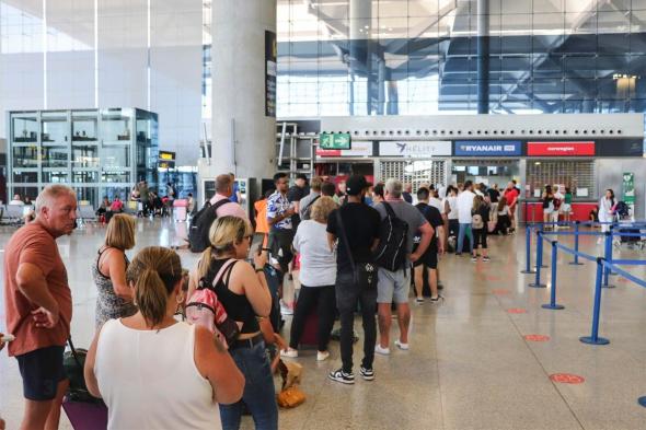 En la terminal de Málaga Costa del Sol la huelga ha dejado desde primera hora de la mañana de este domingo largas colas de pasajeros cansados y frustrados en el mostrador de la empresa irlandesa.