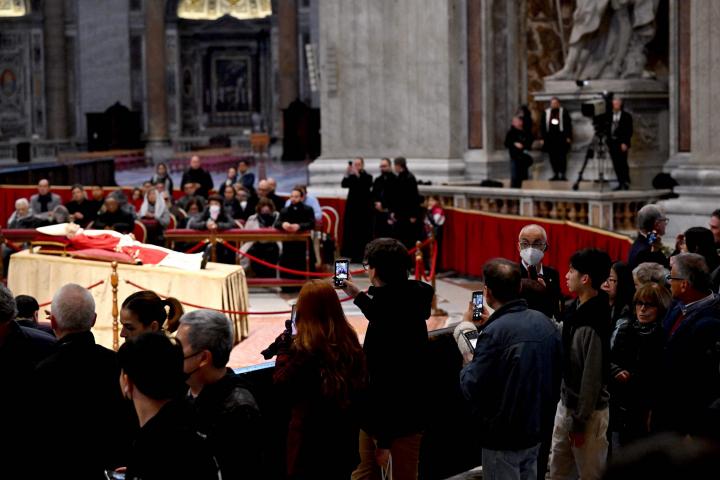 Ratzinger, que en 2013 fue el primer pontífice en renunciar en los últimos seis siglos, yacía sobre un catafalco de tela dorada a los pies del Altar de la Confesión y del baldaquino de Bernini, sobre el lugar en el que según la tradición fue sepultado San Pedro.