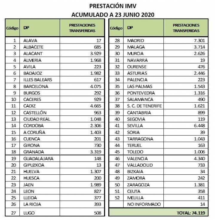 Así se reparten los hogares que reciben el primer pago del ingreso mínimo vital por provincias: