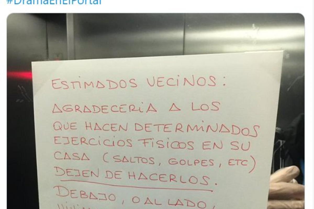 El escritor Marc Pastor ha compartido en su cuenta de Twitter un cartel en el que un vecino lamenta que se escuchen “determinados ejercicios físicos” lo que incluye “golpes y saltos”. “Debajo o al lado vivimos otras personas que no tenemos que soportar los golpes el ruido o la vibración que provocan”.