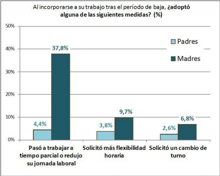 En España, los padres trabajadores usan las medidas de conciliación de la vida laboral y familiar mucho menos que las madres trabajadoras. Por ejemplo, tomemos un indicador muy general, como es el trabajo a tiempo parcial. En España, trabajar a tiempo parcial se asocia en gran medida con la precariedad laboral y, en determinadas franjas de edad, con el intento de conciliar la vida laboral y familiar. Según la Encuesta de Población Activa, el porcentaje de hombres (ocupados entre 30-44 años) que trabajaban a tiempo parcial en el primer trimestre de 2017 era del 6,9%, mientras que el porcentaje de mujeres que hacían lo mismo era del 31,5%.