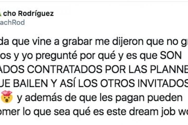 “En la boda que vine a grabar me dijeron que no grabara a 2 invitados y yo pregunté por qué y es que SON INFILTRADOS CONTRATADOS POR LAS PLANNERS PARA QUE BAILEN Y ASÍ LOS OTROS INVITADOS SE ANIMEN y además de que les pagan pueden tomar/comer lo que sea qué es este dream job wow”, ha escrito.