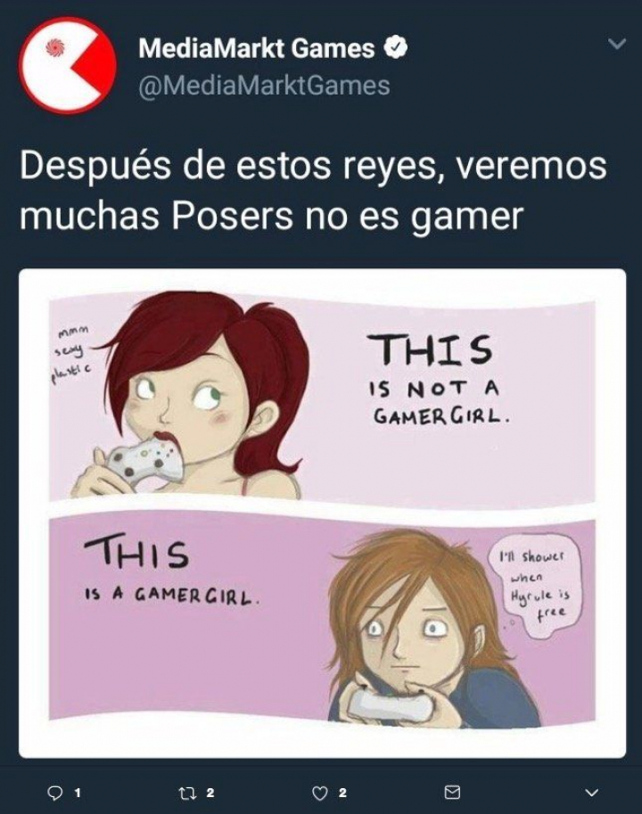 La imagen consta de dos viñetas. En la primera de ellas, puede verse a una chica posando para una foto junto al mensaje "esto no es una jugadora". La otra viñeta muestra a otra chica visiblemente menos arreglada que la primera con un bocadillo que ilustra el pensamiento "me ducharé cuando Hyrule sea libre". (Hyrule es uno de los mundos del videojuego Legend Of Zelda). La imagen asegura: "esto es una jugadora".