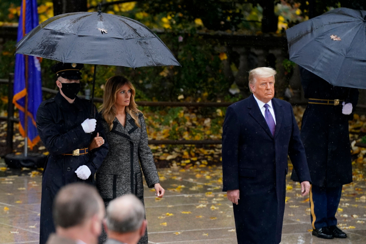 Melania llegó al cementerio de Arlington con un abrigo largo de tweed en color gris, sin mascarilla, con gesto serio y alejada de su marido. De hecho, la primera dama permaneció durante todo agarrada del brazo de un soldado que la protegía de la lluvia con un gran paraguas.