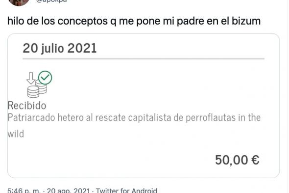 Una tuitera, @apokpa, ha triunfado con su hilo de los irónicos mensajes que le pone su padre cuando le hace un Bizum, como “Patriarcado hetero al rescate capitalista de perroflautas in the wild” o “Subvención porxufontística a la independizada de pa sucat amb oli”.