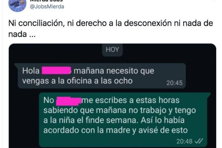 Nos imaginamos el rostro del trabajador que recibe este mensaje a tenor de la respuesta: “Me escribes a estas horas sabiendo que mañana no trabajo y tengo a la niña el fin de semana. Así lo había acordado con la madre y avisé de esto”.