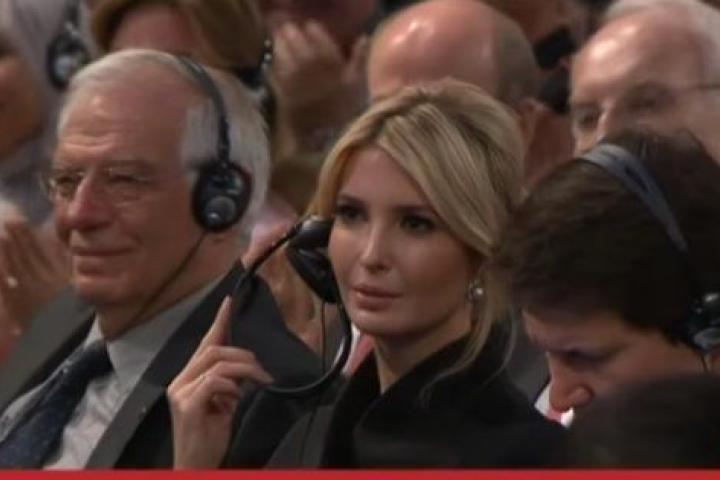 En ese momento todo el público —salvo Ivanka Trump— prorrumpió en aplausos. Cuando las cámaras apuntaron a la hija y asesora del presidente, que estaba sentada al lado del ministro de Asuntos Exteriores español, Josep Borrell, se percibió que a ella no le había hecho mucha gracia la ocurrencia de Merkel.