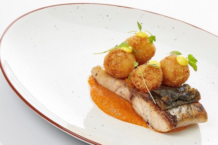 Merluza al vapor sobre Arancini de mozzarella con pesto Calabrese