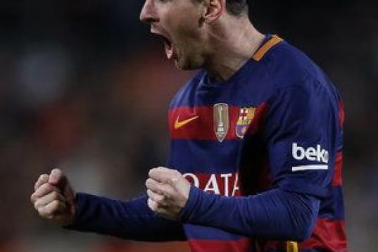 Barcelona's forward Lionel Messi, from Argentina, celebrates after scoring their second goal during the Champions League round of 16 second leg soccer match between FC Barcelona and AC Milan at Camp Nou stadium, in Barcelona, Spain, Tuesday, Mar...