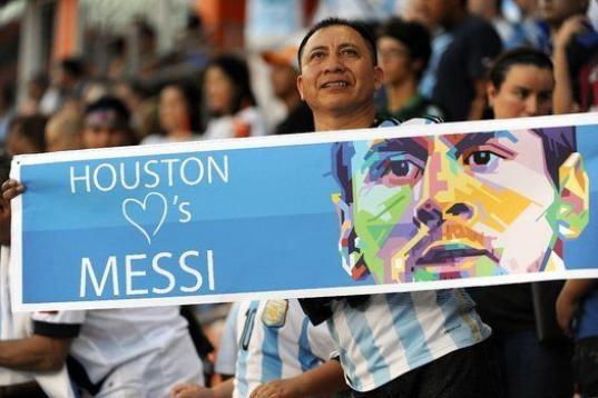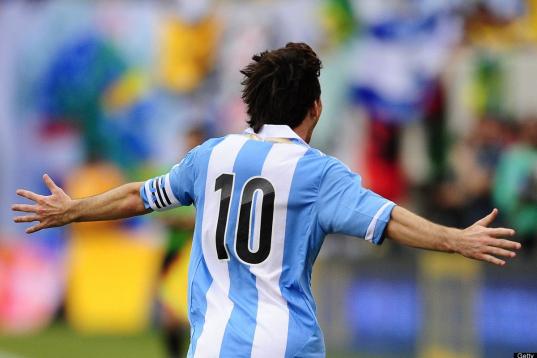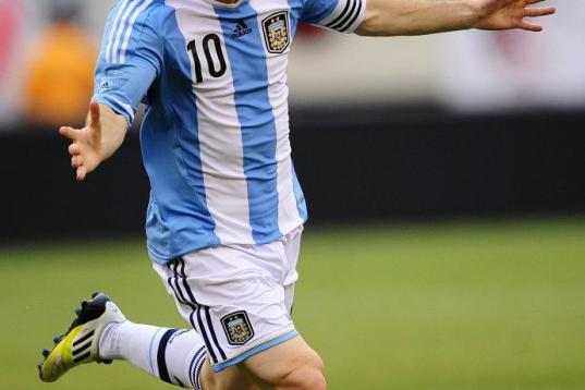 Argentinian soccer player Lionel Messi celebrates after scoring his third goal during a friendly match against Brazil at the MetLife Stadium in East Rutherford, New Jersey, on June 9, 2012. Argentina won 4-3. AFP PHOTO/Mehdi Taamallah ...