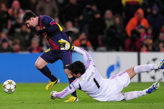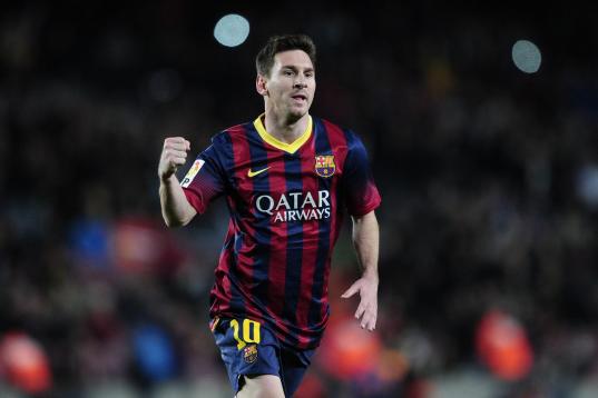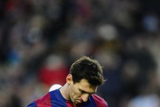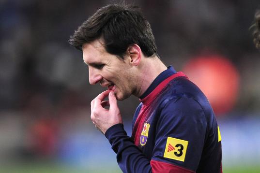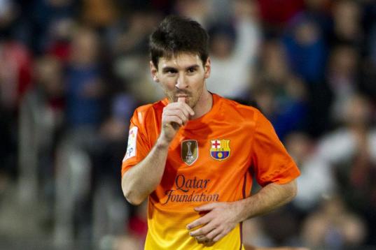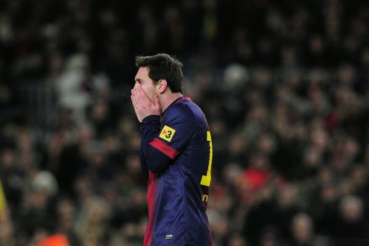 Barcelona's Lionel Messi from Argentina reacts during a Copa del Rey soccer match between FC Barcelona and Real Madrid at the Camp Nou stadium in Barcelona, Spain, Tuesday, Feb. 26, 2013. (AP Photo/Manu Fernandez)