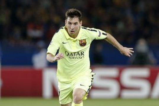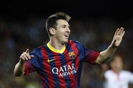 Barcelona's Lionel Messi, from Argentina, smiles during the Champions League quarterfinal second leg soccer match between FC Barcelona and Paris Saint-Germain FC at the Camp Nou stadium in Barcelona, Spain, Wednesday, April 10, 2013. (AP Photo/E...