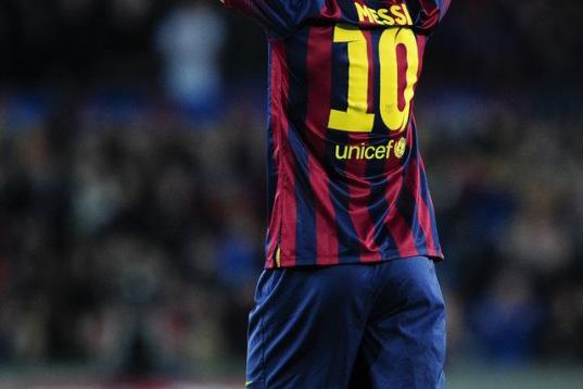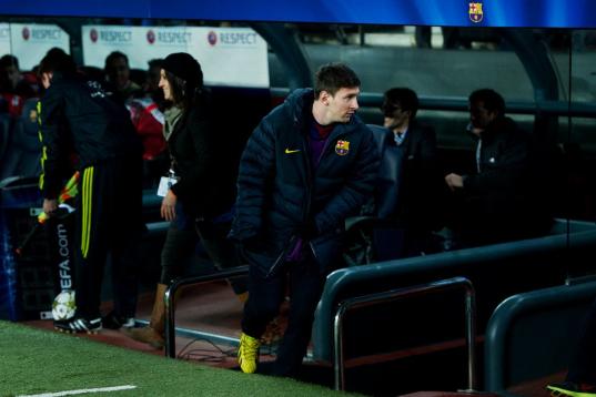 BARCELONA, SPAIN - DECEMBER 05: Lionel Messi of Barcelona enters the pitch to take his place on the bench during the UEFA Champions League Group G match between FC Barcelona and SL Benfica at the Camp Nou stadium on December 5, 2012 in Barcelona...