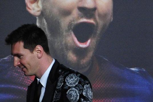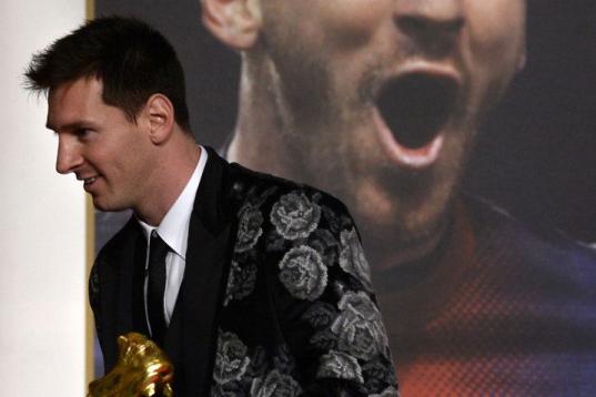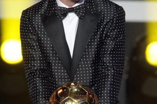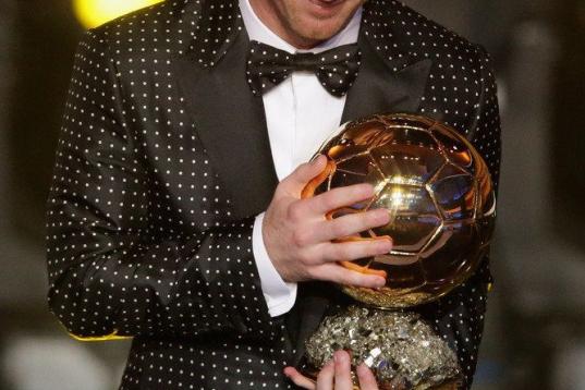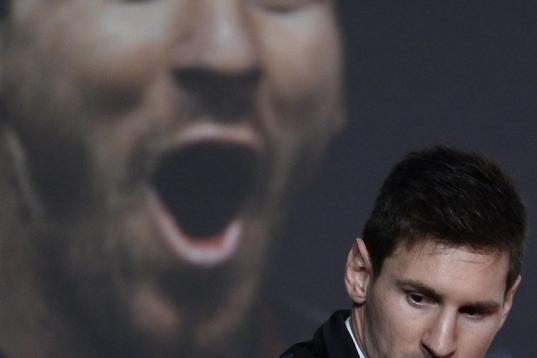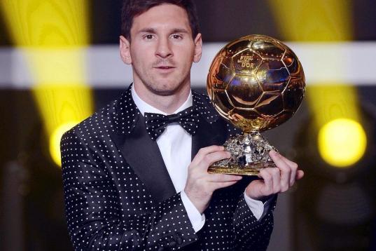 ZURICH, SWITZERLAND - JANUARY 07: Lionel Messi of Argentina receives the FIFA Ballon d'Or 2012 trophy on January 7, 2013 in Zurich, Switzerland. (Photo by Christof Koepsel/Getty Images)