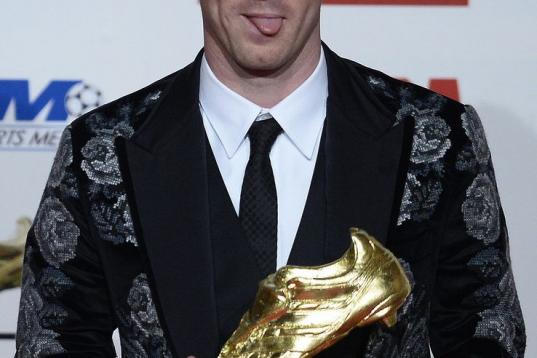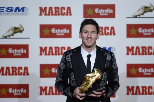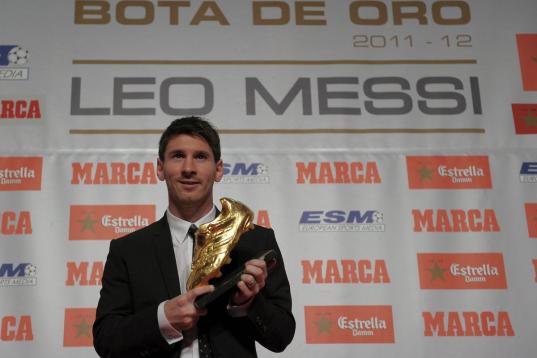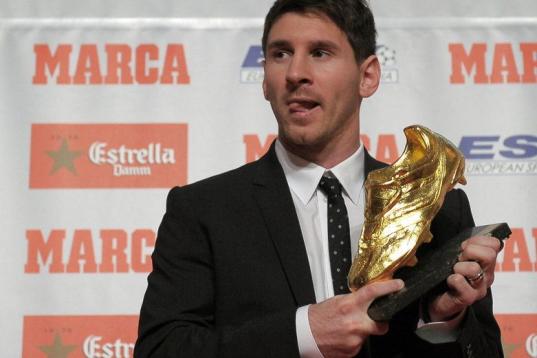 Barcelona's Argentinian forward Lionel Messi poses after receiving the European Golden Boot 2012 award for best European goalscorer of the 2011-2012 season, on October 29, 2012 in Barcelona. Messi scored a Spanish-league record of 50 goals for B...
