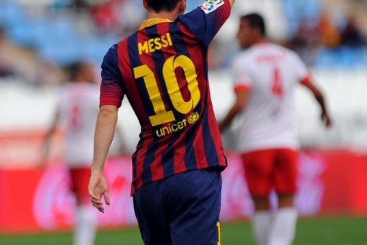 Barcelona's Argentinian forward Lionel Messi celebrates after scoring during the Spanish league football match UD Almeria vs FC Barcelona at the Juegos Mediterraneos stadium in Almeria on September 28, 2013. AFP PHOTO/ JORGE GUERRERO (P...
