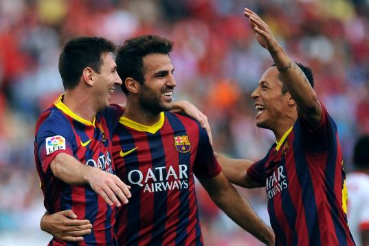 Barcelona's Argentinian forward Lionel Messi (L) celebrates with midfielder Cesc Fabregas after scoring during the Spanish league football match UD Almeria vs FC Barcelona at the Juegos Mediterraneos stadium in Almeria on September 28, 2013. A...