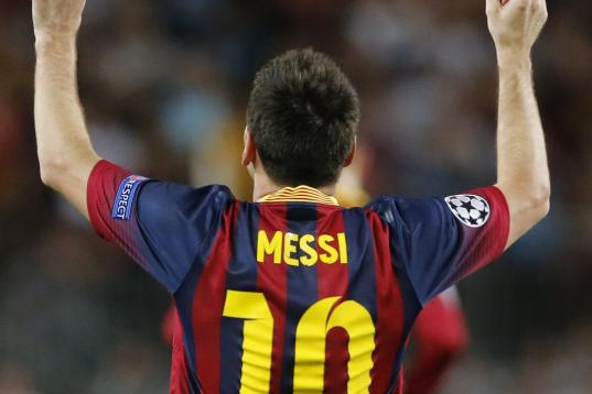 El jugador del Barcelona, Lionel Messi, festeja un gol contra Ajax en la Liga de Campeones el miércoles, 18 de septiembre de 2013, en Barcelona. (AP Photo/Emilio Morenatti)