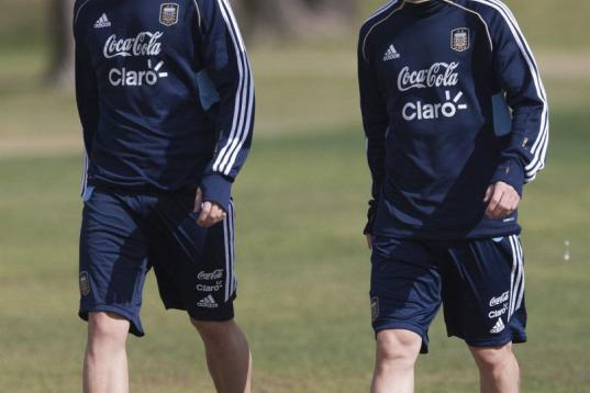 Los jugadores de la selección de Argentina, Lionel Messi, derecha, y Fernando Gago, salen de un entrenamiento el martes, 3 de septiembre de 2013, en Buenos Aires. (AP Photo/Eduardo Di Baia)