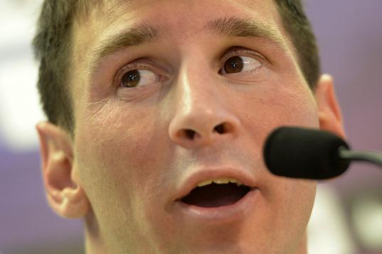 Barcelona's Argentinian forward Leo Messi gives a press conference after taking part to a training session at the Sports Center FC Barcelona Joan Gamper in Sant Joan Despi, near Barcelona, on July 17, 2013. AFP PHOTO/ LLUIS GENE (Photo ...