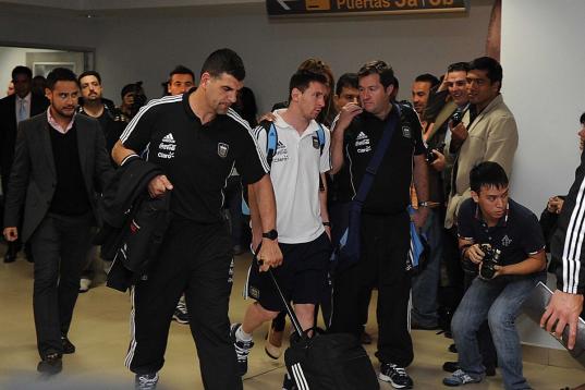 Barcelona's Lionel Messi from Argentina, center, walks to a waiting vehicle upon his arrival at La Aurora airport in Guatemala City, early Wednesday, June 12, 2013. A tax fraud lawsuit has been filed by a Spanish state prosecutor of Catalonia ag...