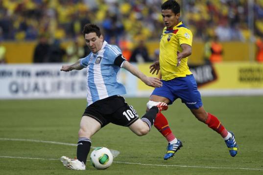 Argentina's Lionel Messi, left, kicks the ball next t Ecuador's Fernando Saritama during a 2014 World Cup qualifying soccer match in Quito, Ecuador, Tuesday, June 11, 2013. (AP Photo/Dolores Ochoa).