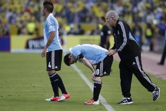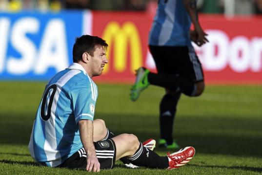 Argentina's Lionel Messi sits on the pitch during a World Cup 2014 qualifying soccer match against Bolivia in La Paz, Bolivia, Tuesday, March 26, 2013. (AP Photo/Juan Karita)