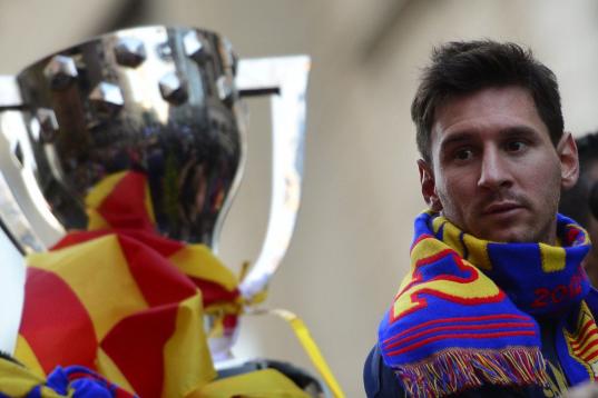 Barcelona's Argentinian forward Lionel Messi looks at the cup as he and his teammates parade on a bus through a crowd of supporters celebrating in the streets of Barcelona on May 13, 2013, two days after their team won the Spanish league. The Ca...