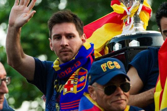 BARCELONA, SPAIN - MAY 13: Lionel Messi of FC Barcelona celebrates with team-mates on an open top bus during their victory parade after winning the Spanish Liga title on May 13, 2013 in Barcelona, Spain. (Photo by David Ramos/Getty Images)