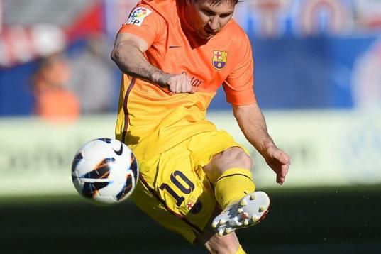 Barcelona's Argentinian forward Lionel Messi kicks the ball during the Spanish league football match Atletico de Madrid vs Barcelona on May 12, 2013 at Vicente Calderon stadium in Madrid. AFP PHOTO/ PIERRE-PHILIPPE MARCOU (Photo credit sh...