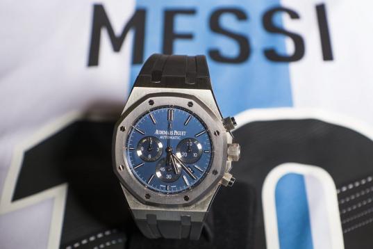 The Royal Oak Chronograph Leo Messi No. 10 by Audermas Piguet, is pictured with the jersey of the national soccer team of Argentina during an auction preview at Sotheby's in Geneva, Switzerland, Tuesday, May 7, 2013. The sale is scheduled on May...