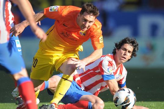 MADRID, SPAIN - MAY 12: Lionel Messi (L) of FC Barcelona gets past Tiago Cardoso Mendez of Club Atletico de Madrid during the La Liga match between Club Atletico de Madrid and FC Barcelona at Vicente Calderon Stadium on May 12, 2013 in Madrid,...