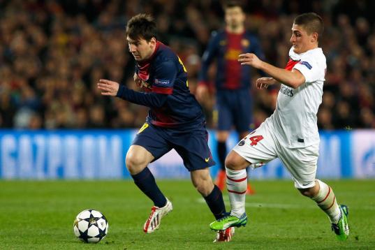 Barcelona's Lionel Messi, from Argentina, left, escapes PSG's Marco Verratti, from Italy, during the Champions League quarterfinal second leg soccer match between FC Barcelona and Paris Saint-Germain FC at the Camp Nou stadium in Barcelona, Spai...