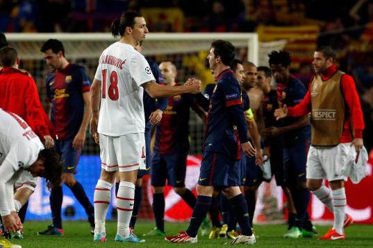 PSG's Zlatan Ibrahimovic, from Sweden, left, shakes hands with Barcelona's Lionel Messi, from Argentina, at the end of the Champions League quarterfinal second leg soccer match between FC Barcelona and Paris Saint-Germain FC at the Camp Nou stad...