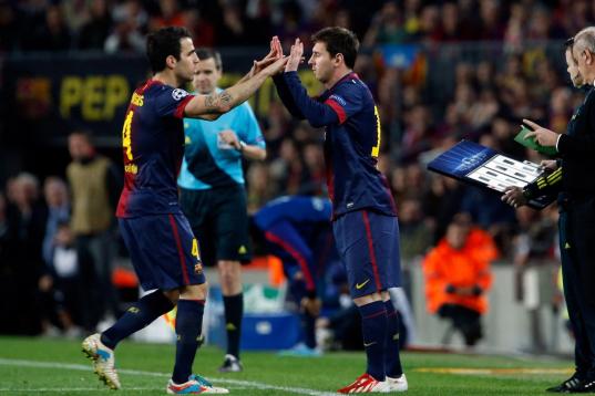 Barcelona's Lionel Messi, from Argentina,who started the game on the bench, replaces teammate Cesc Fabregas during the Champions League quarterfinal second leg soccer match between FC Barcelona and Paris Saint-Germain FC at the Camp Nou stadium ...