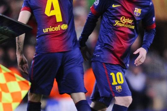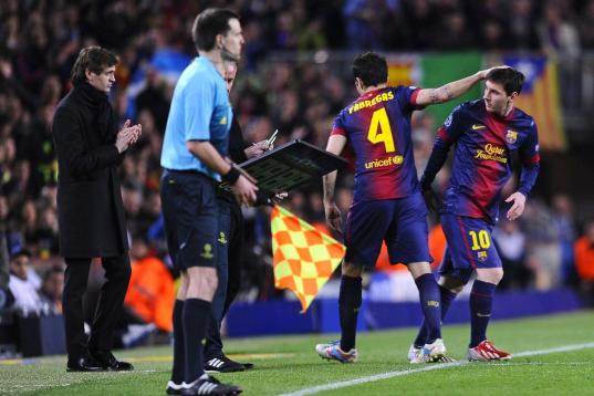 Barcelona's Lionel Messi, from Argentina, right, looks at Barcelona's head coach Francesc 'Tito' Vilanova, left, as he replaces Barcelona's Cesc Fabregas during the Champions League quarterfinal second leg soccer match between FC Barcelona and P...