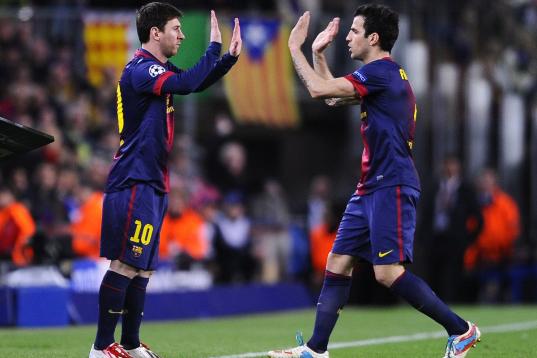 Barcelona's Lionel Messi, from Argentina, left, replaces Barcelona's Cesc Fabregas during the Champions League quarterfinal second leg soccer match between FC Barcelona and Paris Saint-Germain FC at the Camp Nou stadium in Barcelona, Spain, Wedn...