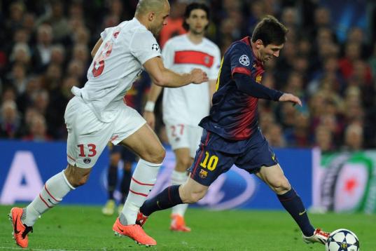 Barcelona's Argentinian forward Lionel Messi celebrates after scoring the opening goal during the Champions League quarter-final football match between PSG and Barcelona at the Parc des Princes stadium in Paris on April 2, 2013. AFP PHOTO /...