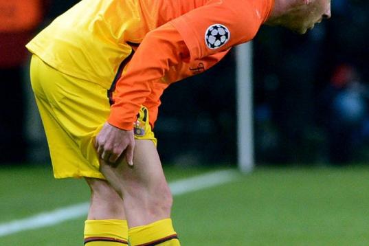 Barcelona's Argentinian forward Lionel Messi holds his leg during the Champions League quarter-final football match between Paris Saint-Germain and Barcelona at the Parc des Princes stadium in Paris on April 2, 2013. AFP PHOTO / FRANCK FIFE ...