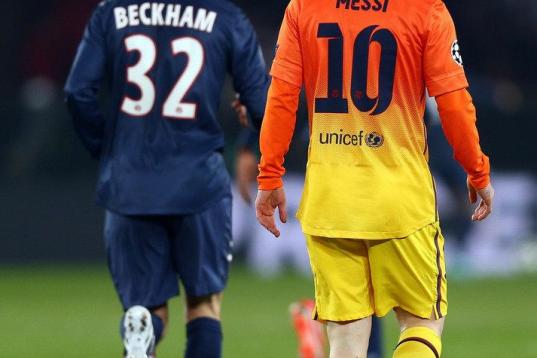 PARIS, FRANCE - APRIL 02: Lionel Messi of Barcelona and David Beckham of Paris Saint-Germain during the UEFA Champions League Quarter Final match between Paris Saint-Germain and Barcelona FCB at Parc des Princes on April 2, 2013 in Paris, Franc...