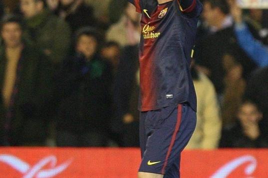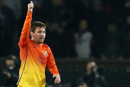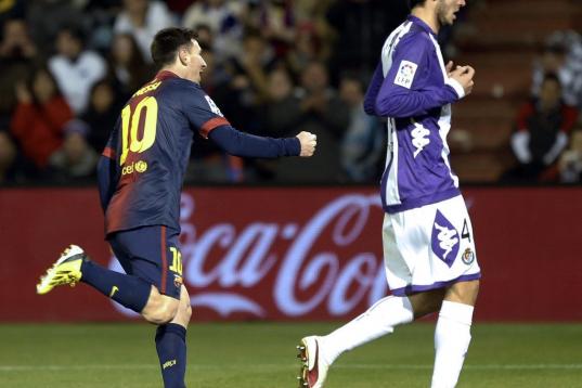 Barcelona's Argentinian forward Lionel Messi celebrates after scoring during the Spanish league football match Real Valladolid vs FC Barcelona at the Jose Zorilla stadium in Valladolid on December 22, 2012. Barcelona won the match 3-1. AFP PHOT...