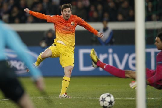 Barcelona's Lionel Messi scores the opening goal while Paris Saint Germain's goalkeeper Salvatore Sirigu of Italy looks on during their Champions League quarterfinal soccer match in Paris,Tuesday, April 2, 2013. (AP Photo/Christophe Ena)