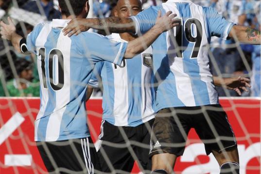 Argentina's Ever Banega, right, celebrates with his teammates Clemente Rodriguez, center, and Lionel Messi, after Ever scored a goal against Bolivia during a 2014 World Cup qualifying soccer game in La Paz, Bolivia, Tuesday, March 26, 2013. (AP ...