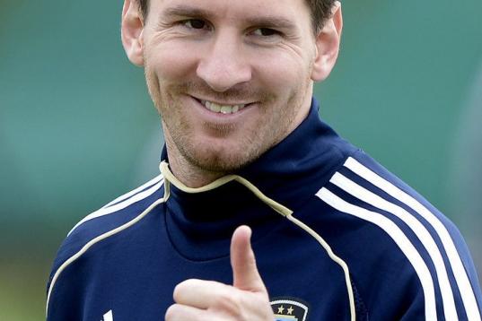 Argentina's forward Lionel Messi smiles during a training session in Ezeiza, Buenos Aires on March 19, 2013 ahead of the Brazil 2014 FIFA World Cup South American qualifier football match against Venezuela on March 22. AFP PHOTO / Juan Mabromata...