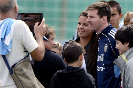 Argentina's forward Lionel Messi (C) poses for pictures with supporters during a training session in Ezeiza, Buenos Aires on March 19, 2013 ahead of the Brazil 2014 FIFA World Cup South American qualifier football match against Venezuela on Marc...