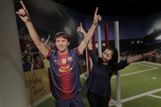 A visitor poses with the wax figure of Lionel Messi at the Madame Tussauds exhibition in Tokyo, Wednesday, March 13, 2013.(AP Photo/Itsuo Inouye)