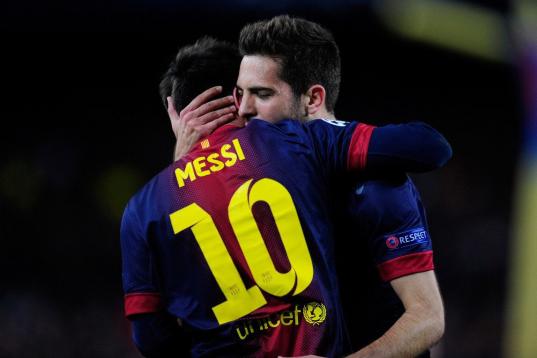 Barcelona's Lionel Messi, from Argentina, right, replaces Barcelona's Cesc Fabregas during the Champions League quarterfinal second leg soccer match between FC Barcelona and Paris Saint-Germain FC at the Camp Nou stadium in Barcelona, Spain, Wed...